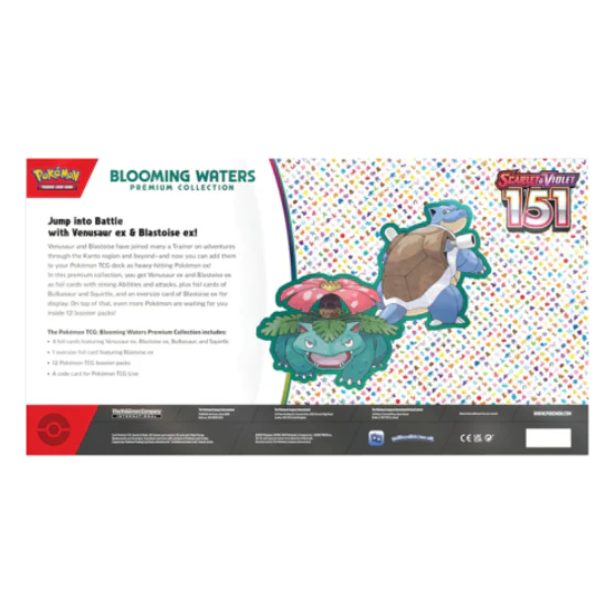 The Pokémon TCG: Blooming Waters Premium Collection includes: 4 foil cards featuring Venusaur ex, Blastoise ex, Bulbasaur, and Squirtle, 1 oversize foil card featuring Blastoise ex, 12 Pokémon TCG booster pack and a code card for Pokémon TCG Live