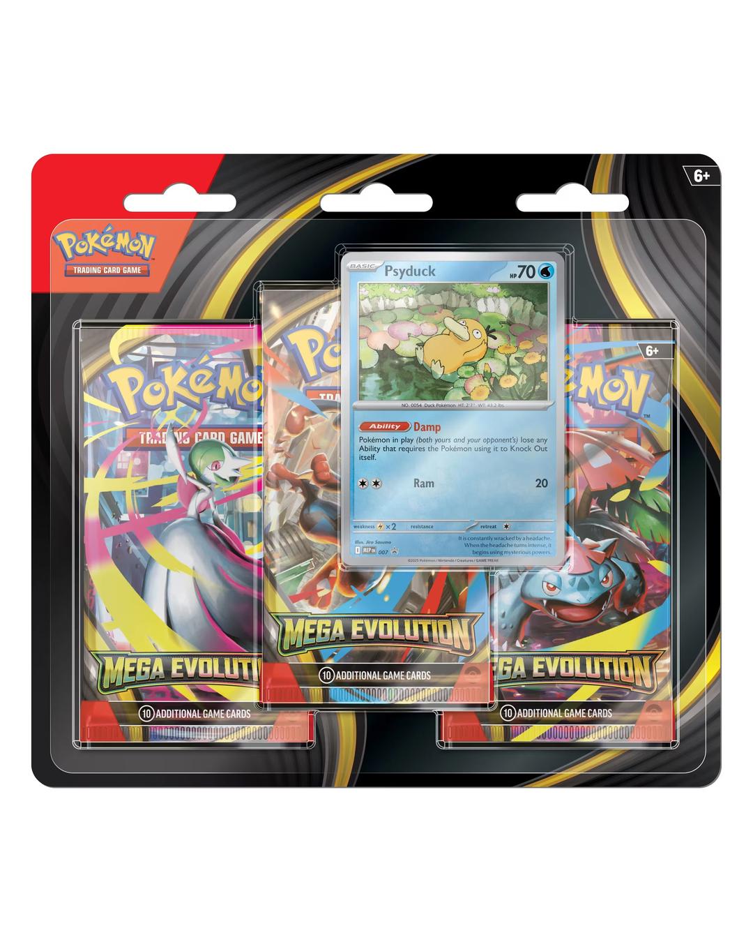 Each Pokemon TCG: Mega Evolution Three-Booster Blister includes three awesome booster packs from the new Mega Evolution expansion, plus 1 Promo Card of either Golduck or Psyduck.